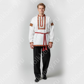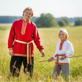 Фасон рубахи удобен и не ограничивает движения. Жесткий воротник, пуговицы отсутствуют, рукав втачной, немного спущенный, свободный, длина рукава примерно до локтя. По бокам внизу разрезы. К рубахе прилагается пояс. Декор на груди выполнен из жаккардовой тесьмы в натуральном цвете. Для подбора правильного размера, в заказе, пожалуйста, пишите рост, обхват груди и талии.