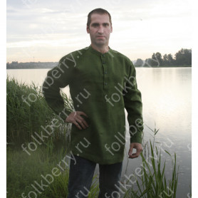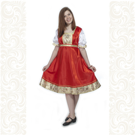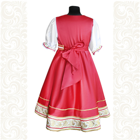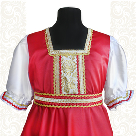 Платье. Сшито из умягченной льняной ткани белого цвета, декорировано красным кружевом, серебристой тесьмой и бархоткой. Длина – до пят. Крой слегка расклешен к низу. Верх собран на резинку, украшен натуральным хлопковым кружевом. Рукав «реглан» со съемными красными манжетами. Имеется пояс.