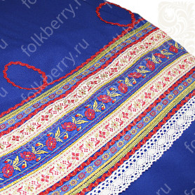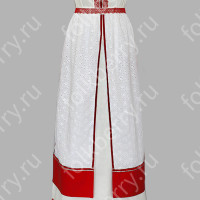Юбка-понева. Представляет собой три полотна сшитых на поясе. Изготовлена из тонкого, хлопкового, ажурного шитья. На белом фоне красиво смотрятся красные бархотка и кружево, а также серебристая тесьма.