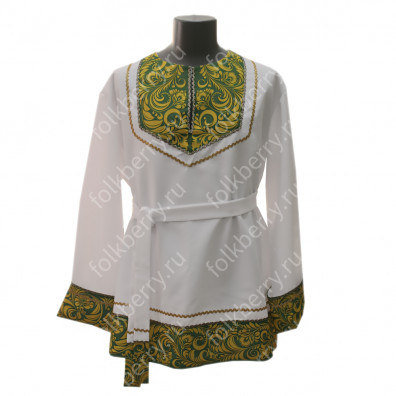 Рубаха для мужчин и детей модели «Николай» предназначается для традиционных русских праздников и мероприятий. Наряд сшит из габардина, белоснежного цвета. Орнамент «хохлома» на вороте, груди, манжетах и по низу сделан несмываемой краской – желто-зеленого цвета и по его контуру струится изящная тесьма золотистого цвета. Краска не смывается при стирке, не линяет, поэтому орнамент остается стойким на протяжении всего срока эксплуатации. К рубахе прилагается пояс с рисунком на концах.