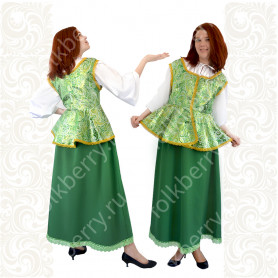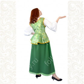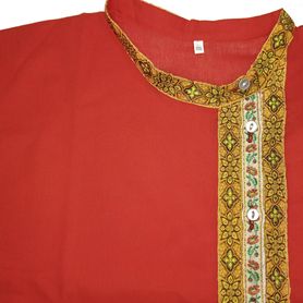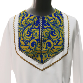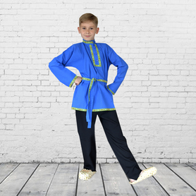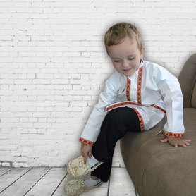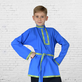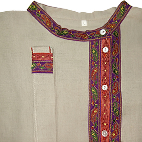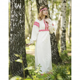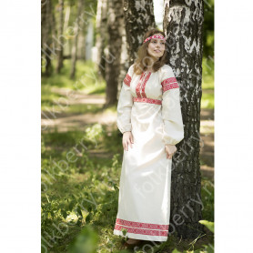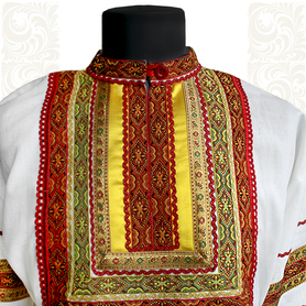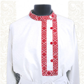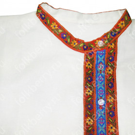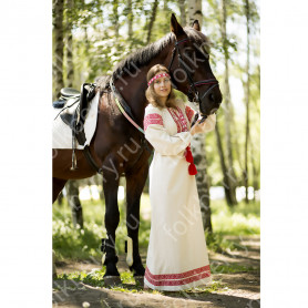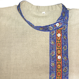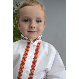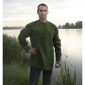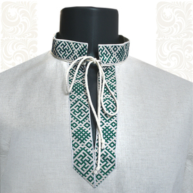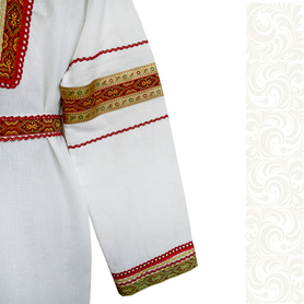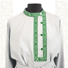 Косоворотка свободного покроя, с длинным рукавом, с поясом-кушаком. Декорирована жаккардовой тесьмой с изображениями славянских символов процветания, здоровья, удачи, благосостояния, силы. Декор четкий, понятный, напоминает вышивку крестом. Зеленый цвет декора тоже символичен. Косоворотка выполнена из плотной, мягкой льняной ткани белого цвета. Предназначена для праздничных моментов. Смотрится стильно и современно с современными элементами одежды.