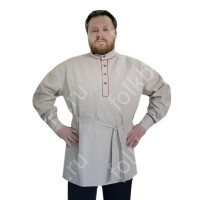 Косоворотка Русич выполнена из хлопка или габардина ( полиэстер 100%, одежная ткань) на выбор покупателя и декорирована жаккардовой тесьмой. Косоворотка в традиционном стиле, с поясом-кушаком, декор по горловине, груди, запястьям, талии, бедрам ( славяне наносили декор в тех местах, где бьется пульс). В декоре "зашиты" обережные символы здоровья, силы, удачи, процветания, принятые в Древней Руси. Декоративная тесьма смотрится очень эффектно, т. к. имеет четкий рисунок, напоминающий вышивку крестом.