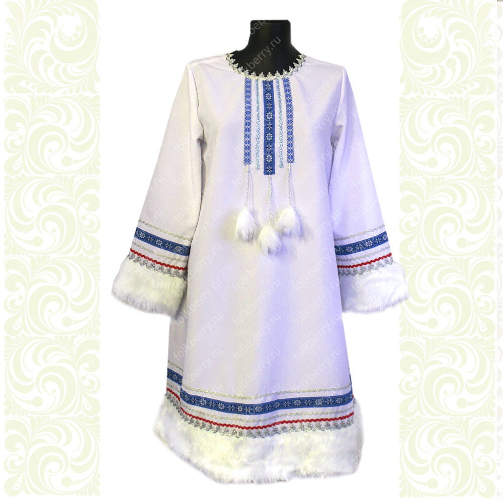 Костюм выполнен из парчи бело-серебристого цвета. Костюм декорирован искусственным мехом белого цвета. Застежка - потайные кнопки. Силуэт - приталенный, сзади кулиска для регулировки талии. Красивый пышный рукав. Отделка - серебристая ажурная тесьма. Длина шубки по спинке 93-98 см (от седьмого шейного позвонка до низа изделия).