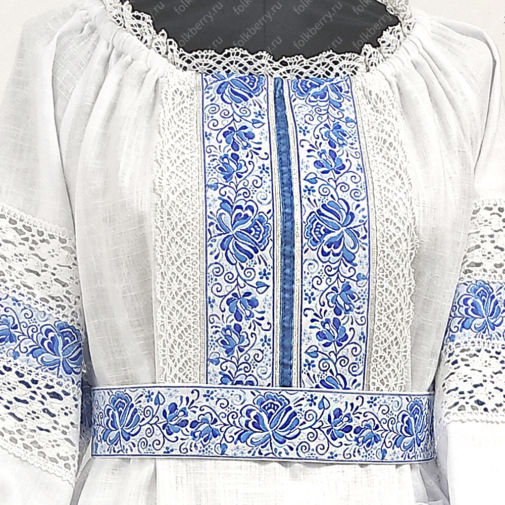 Платье изготовлено из умягченного белого льна и украшено жаккардовой тесьмой с узорами Гжель и белым кружевом разной ширины, а также бархоткой и изысканной серебристой тонкой тесьмой. Платье силуэта А, расклешено к низу. В комплект входит пояс с веревочками на концах. Рукава - удобный реглан, также декорированы кружевом и жаккардовой тесьмой. Платье немного просвечивает, желательно надевать с легким подъюбником или юбкой-поневой.