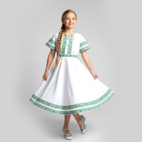 Декор платья - жаккардовая тесьма со славянскими символами. Талия немного завышена, пояс в комплекте.