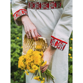 - длинной женской  рубахи (туники) с поликами и и разрезами по бокам, декорированой жаккардовой тесьмой;