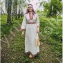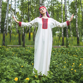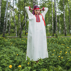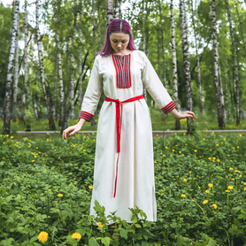 Традиционная женская рубаха из небеленого льна известна с дохристианских времен. С тех незапамятных и мудрых времен ее надевали женщины и девушки под сарафан, под фартук, под юбку-поневу, или носили отдельно. Актуальна она и сегодня. Рубаха "Ясногорье" будет органично смотреться как на традиционных славянских мероприятиях, так и в повседневной жизни. Комфортная, выполненная из умягченного льна, украшенная жаккардовой тесьмой с узорами в славянском стиле, дополненная широким поясом, рубаха поможет создать аутентичный образ. Длинная,  слегка расклешенная, по бокам разрезы, под мышками полики. Интересно то, что декор, которым украшена рубаха историчен - он был известен еще в 17 веке и восстановлен на современном ткацком оборудовании.