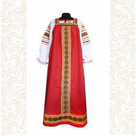 Эта традиционная женская рубаха ( длинная туника с поликами под мышками, с разрезами по бокам, с поясом) из белого льна. Декорирована по низу рукава, подолу и на груди широкой жаккардовой тесьмой с гжельскими мотивами сине-голубого цвета на белом фоне.