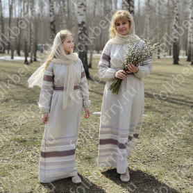 Эта традиционная женская рубаха ( длинная туника с поликами под мышками, с разрезами по бокам, с поясом) из белого льна декорирована по низу рукава, подолу и на груди широкой жаккардовой тесьмой со славянскими обережными символами красного цвета на белом фоне.