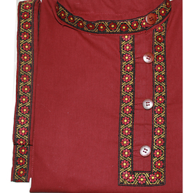 Мужская рубаха «Истоки» выполнена в свободном крое, подходящим любой фигуре. Сшита из льняной ткани. Модель имеет втачной, короткий рукав, ворот с завязками, с поясом (кушаком) из ткани с тесьмой. По низу, вороту, рукавам изделия декор из жаккардовой тесьмы со славянским рисунком- оберегом.