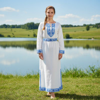 Выполненный в православном стиле сарафан с блузой «Русь» сшит из натурального хлопка в цветочек. Модель скромно декорирована однотонным воланом в цвет с основной тканью и тесьмой вьюнок. Можно носить под пояс и регулировать бретели по длине. Белая блузка из хлопка с длинным рукавом расшита натуральным нежным кружевом.