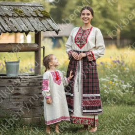 Традиционный сарафанный комплекс в православном стиле включает традиционный сарафан с отрезным фигурным лифом и блузку с длинными рукавами реглан из хлопкового шитья.