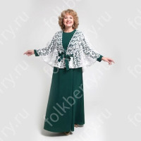 Костюм  выполнен из габардина и красиво подобранного декора в золотистых цветах. Достоинства габардина  в том, что он не мнется, не блестит, как атлас, ложится красивыми  мягкими складками, цвет не выгорает. Юбка  с оборкой, декор в золотистых цветах, по талии на  двойной резинке. Блуза  белого праздничного цвета, с баской,  рукава расширены внизу, с манжетами.   Сзади на блузе шнуровка. Она дает хорошую посадку по фигуре. Костюм предназначен для творческих  сольных и коллективных театральных выступлений.